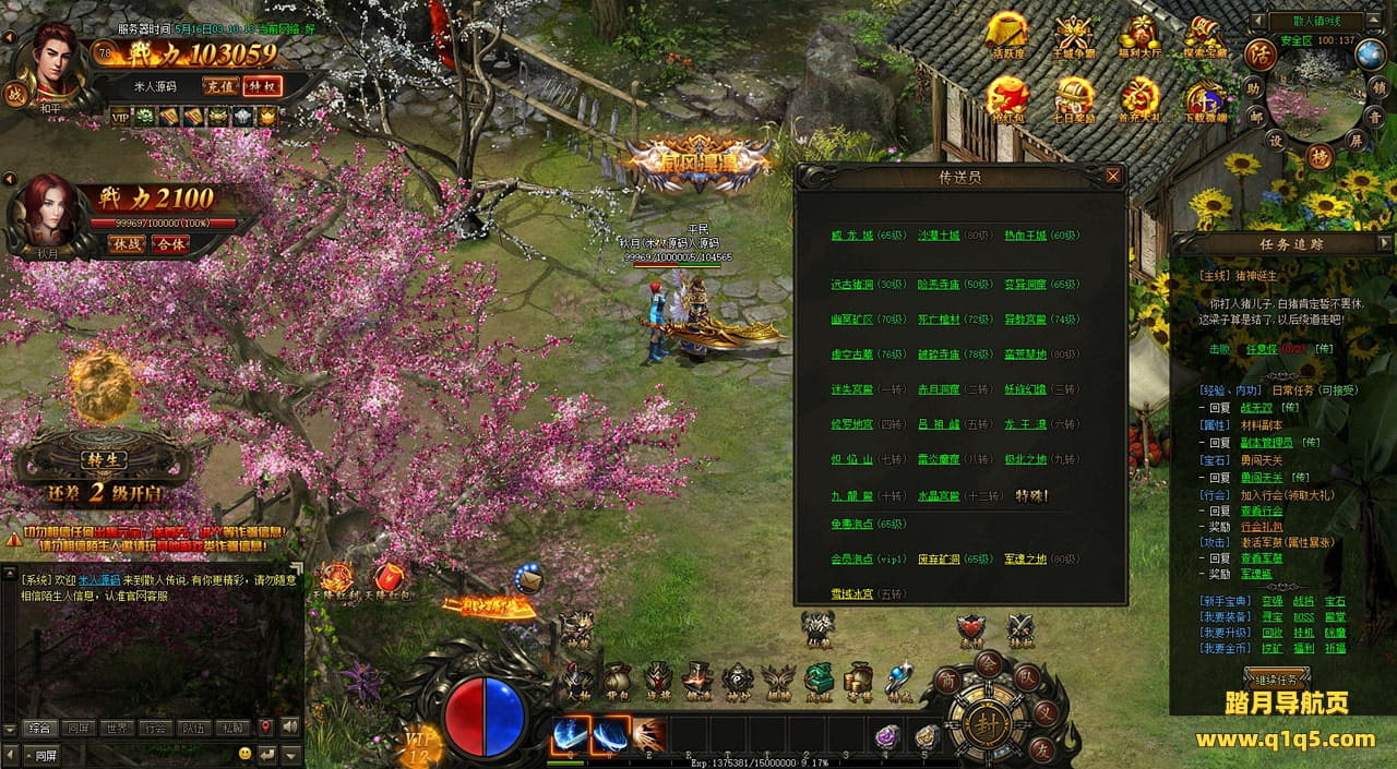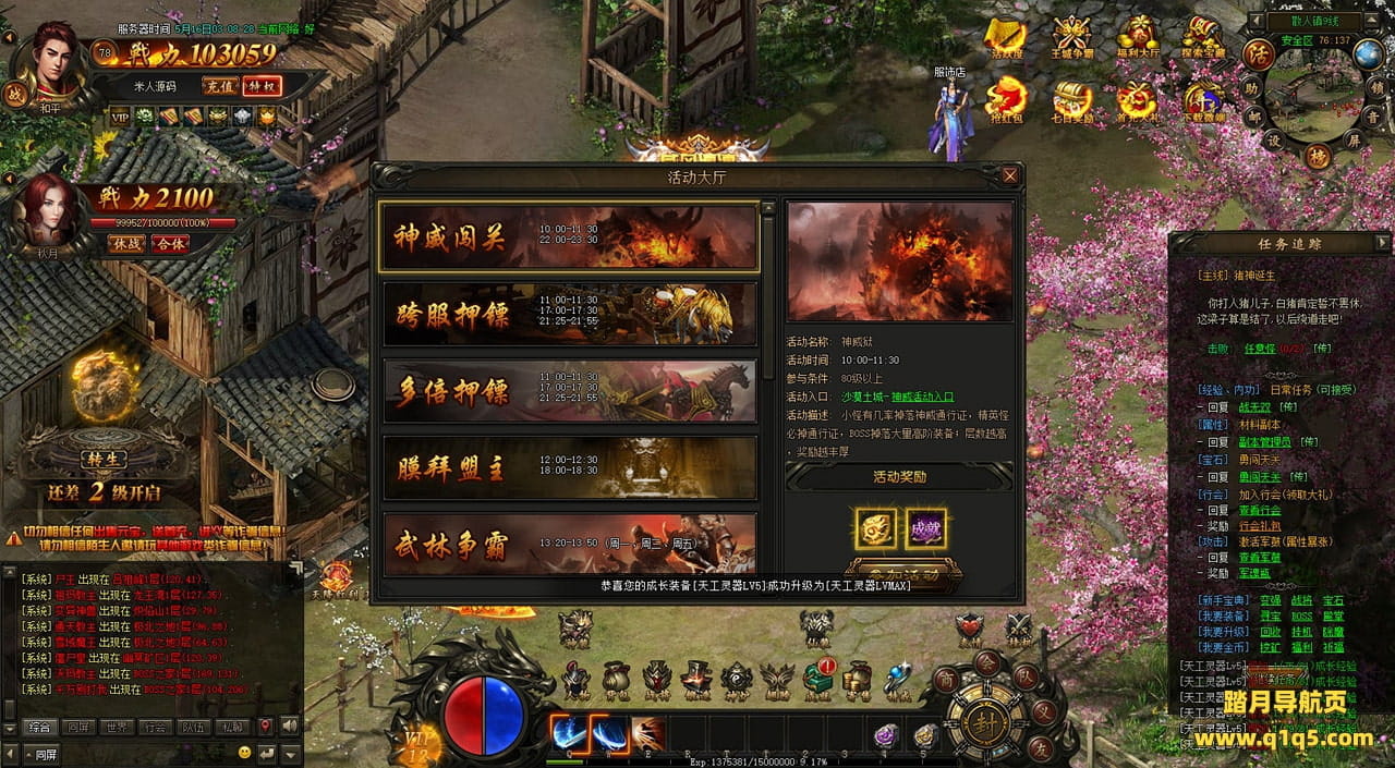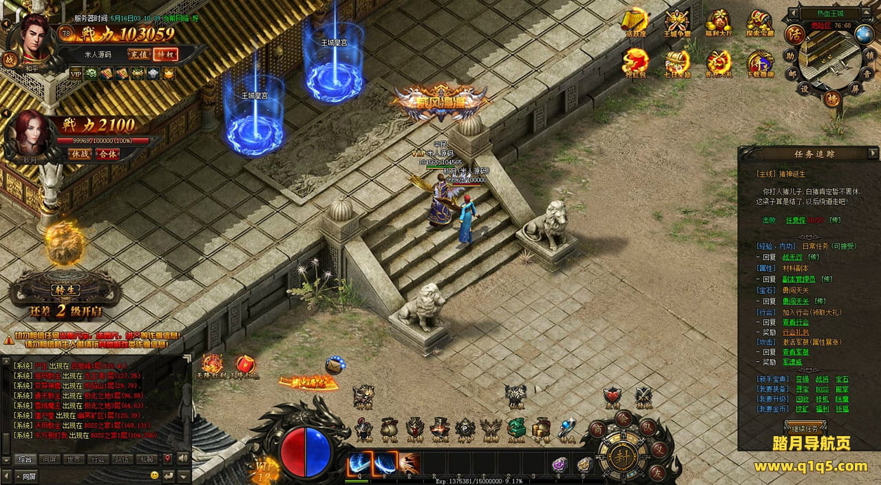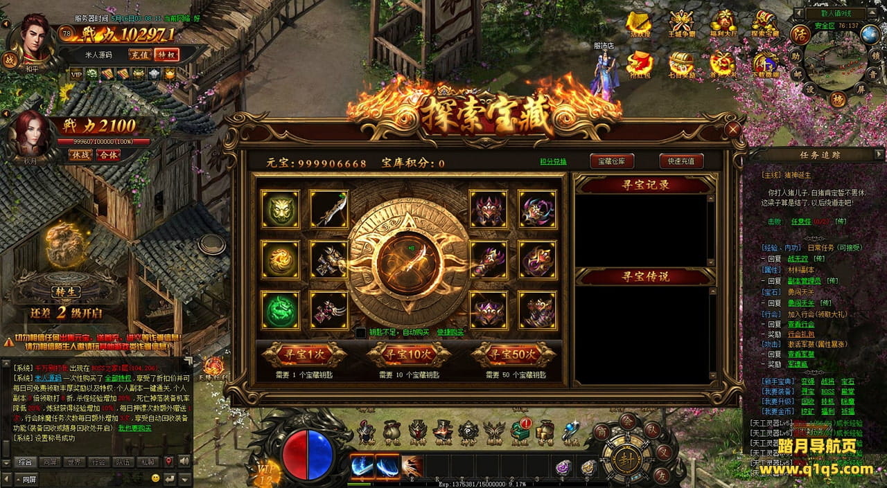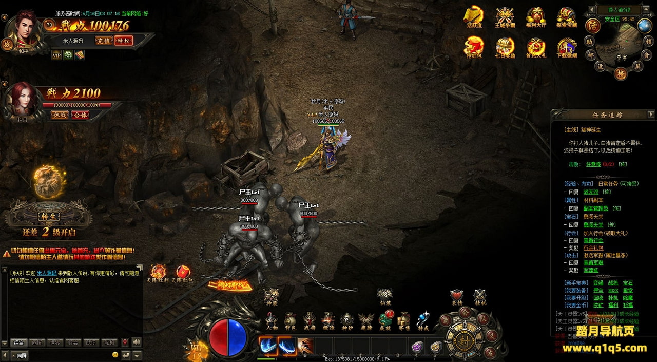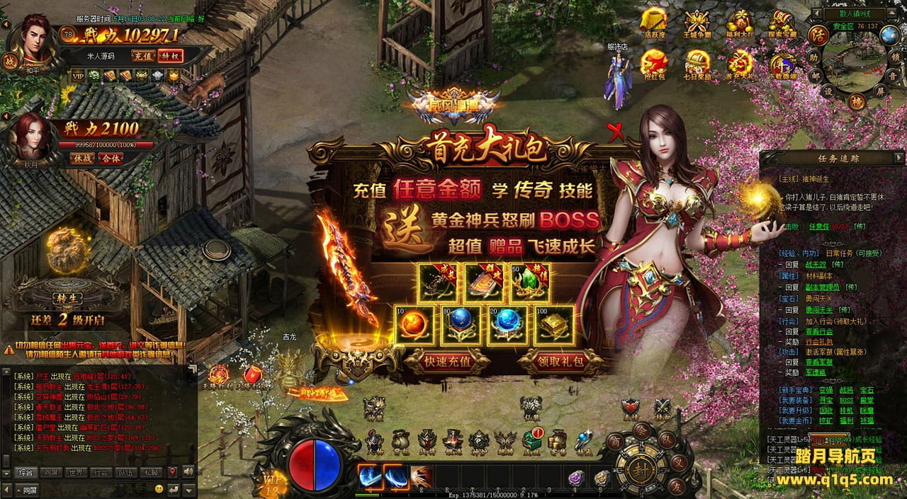 下面我们在进入游戏测试下游戏里的功能看看。遇到这类问题,再次进不去了。就需要确认看是否是DB掉线了。补充启动即可。然后再进入即可。好了,其他功能就自行测试吧。更多的游戏资源可以访问www.q1q5.com下载,我们每款游戏资源均单独制作了独立的视频架设教程,让小白也可以快速上手游戏架设,快来体验自己做GM的乐趣吧!
