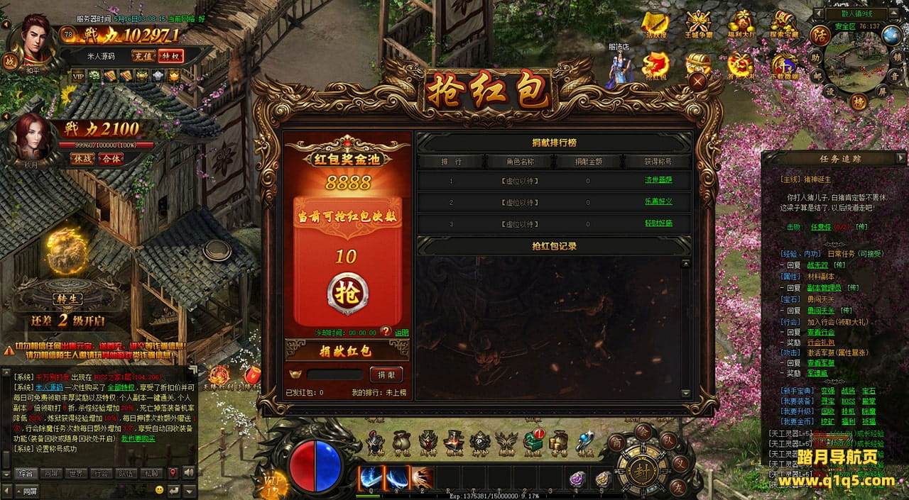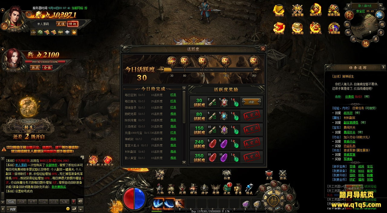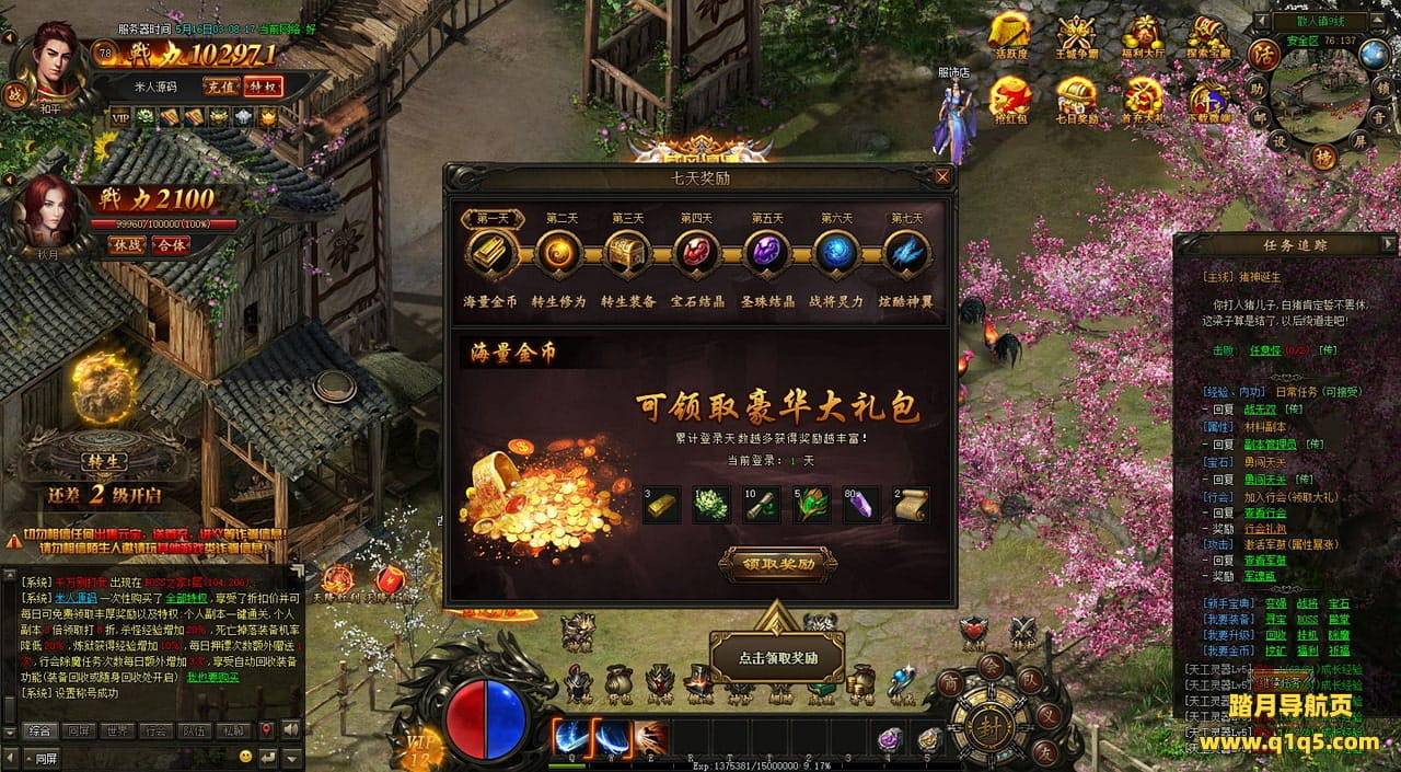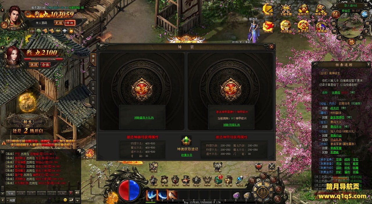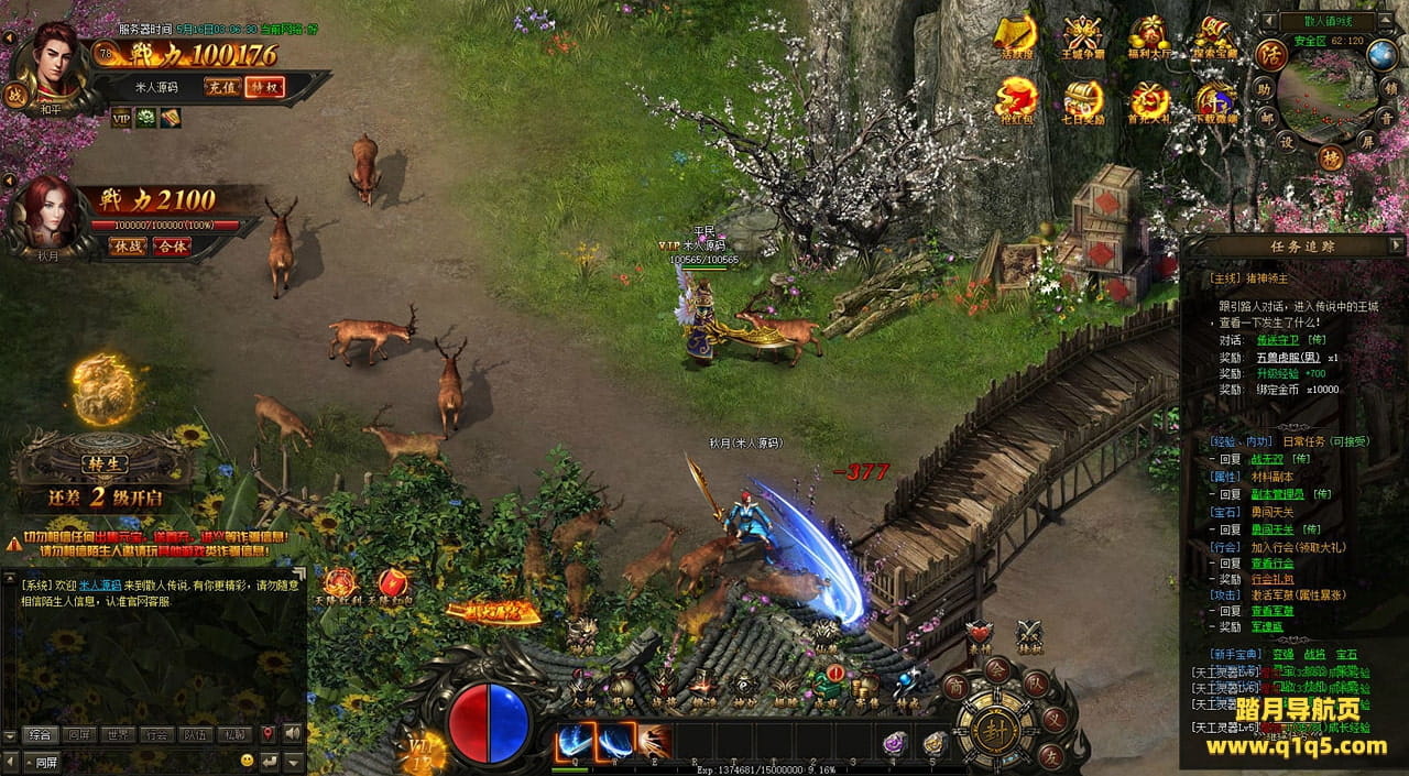 下面我们在进入游戏测试下游戏里的功能看看。遇到这类问题,再次进不去了。就需要确认看是否是DB掉线了。补充启动即可。然后再进入即可。好了,其他功能就自行测试吧。更多的游戏资源可以访问www.q1q5.com下载,我们每款游戏资源均单独制作了独立的视频架设教程,让小白也可以快速上手游戏架设,快来体验自己做GM的乐趣吧!