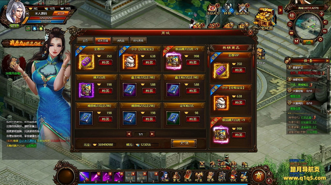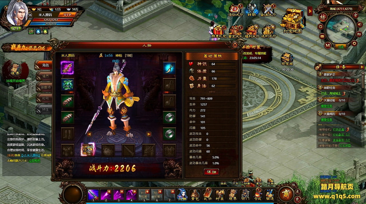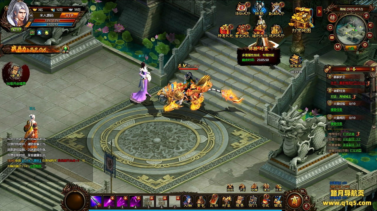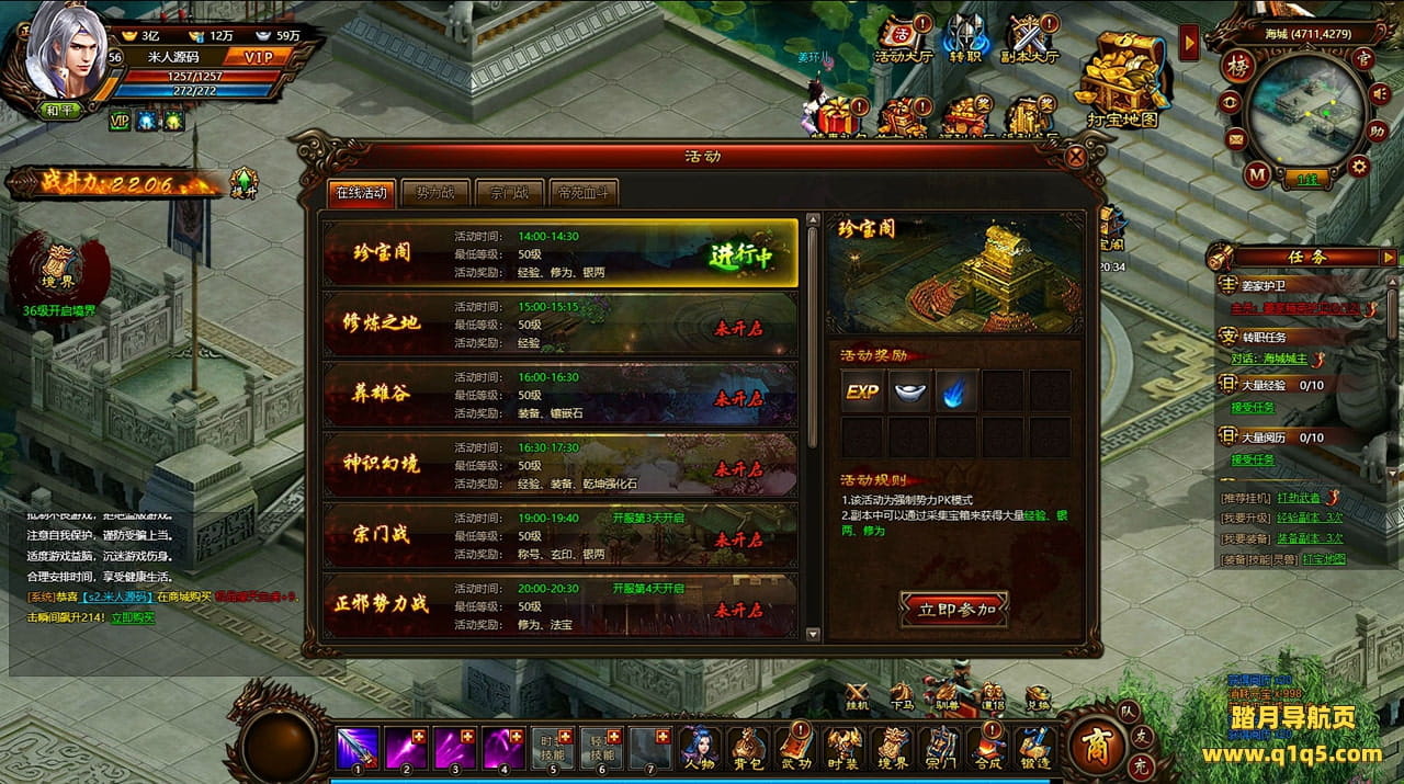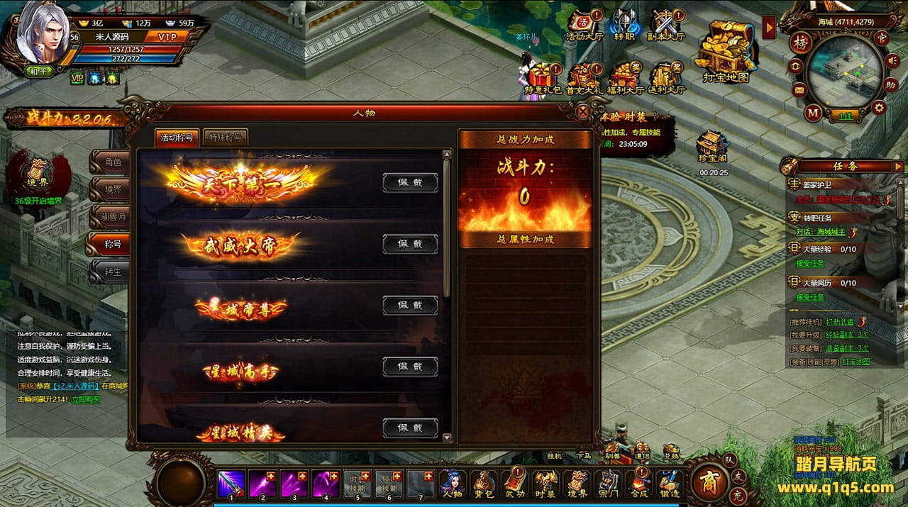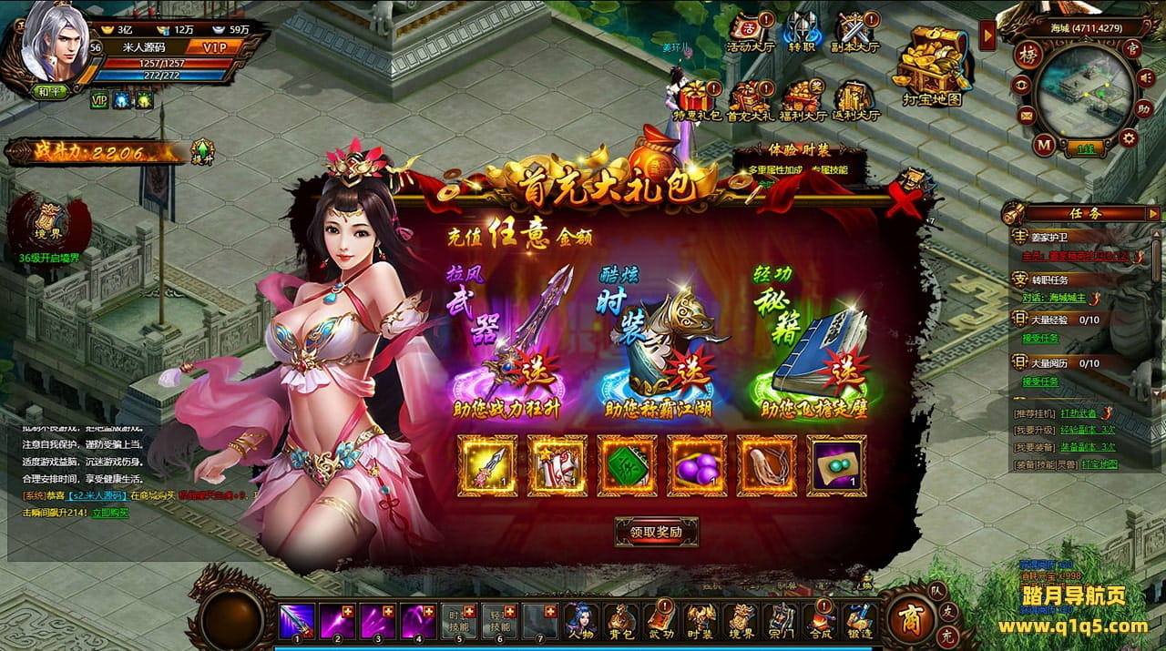 好了,下面我们来测试下游戏里的功能看看。好了。其他功能就自行测试吧。更多的游戏资源可以访问www.q1q5.com下载,我们每款游戏资源均单独制作了独立的视频架设教程,让小白也可以快速上手游戏架设,快来体验自己做GM的乐趣吧!