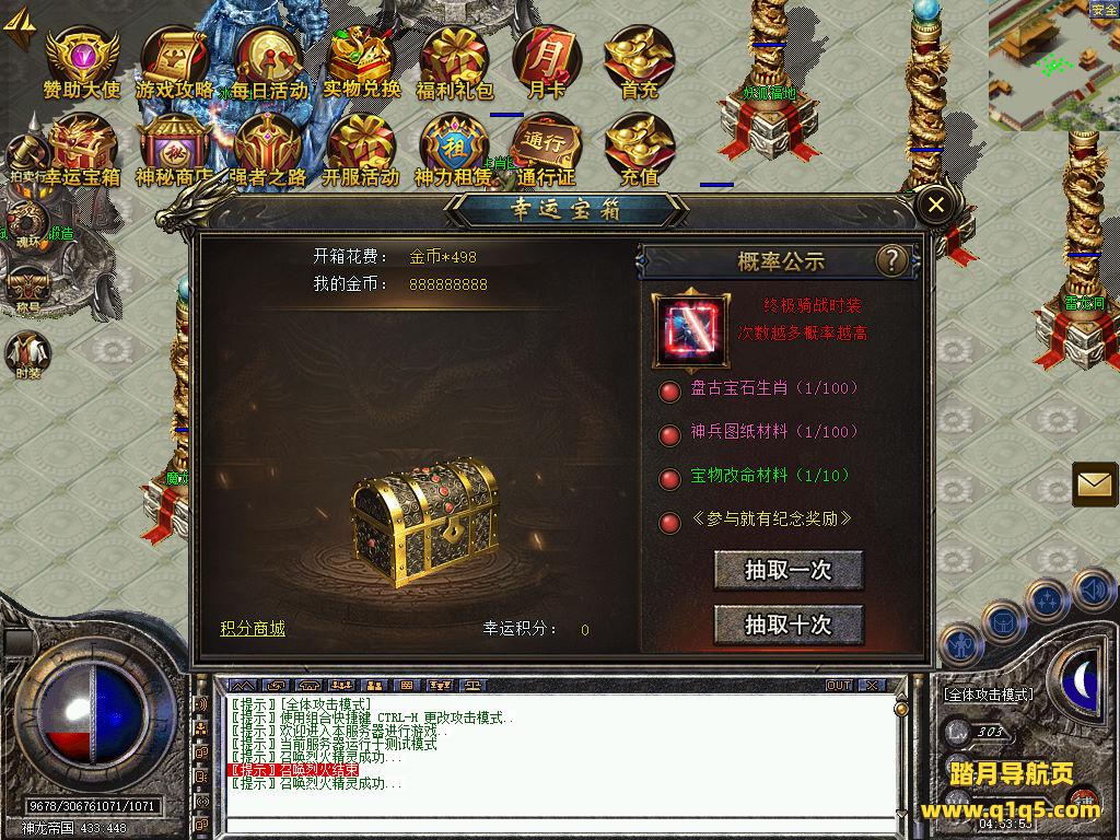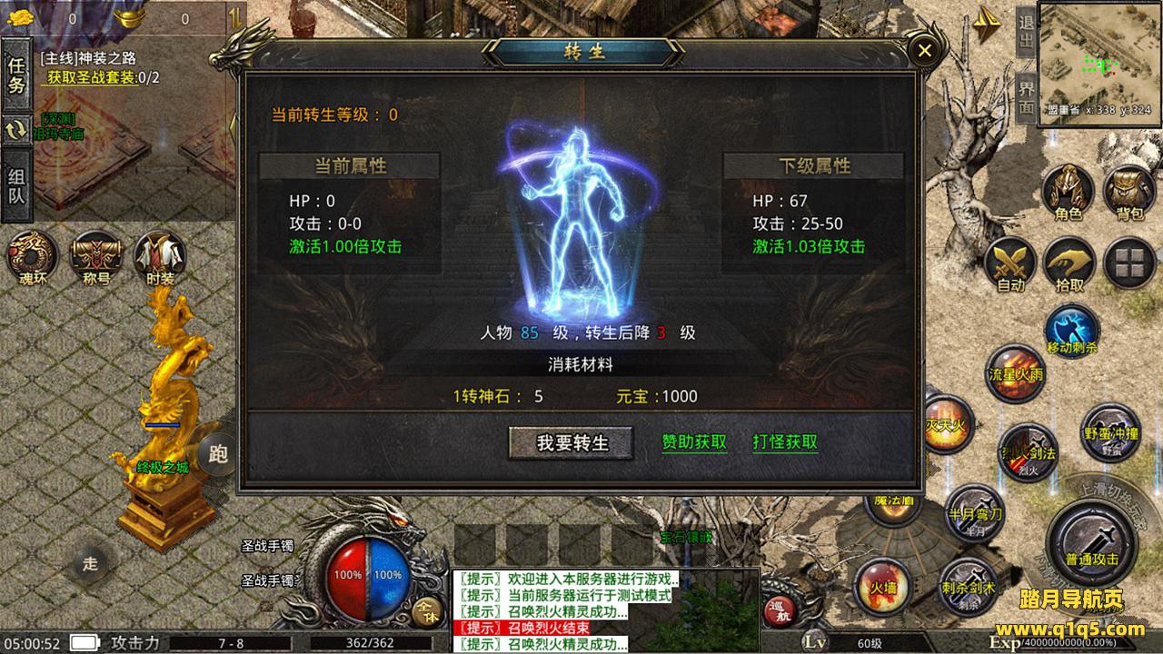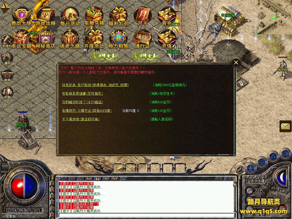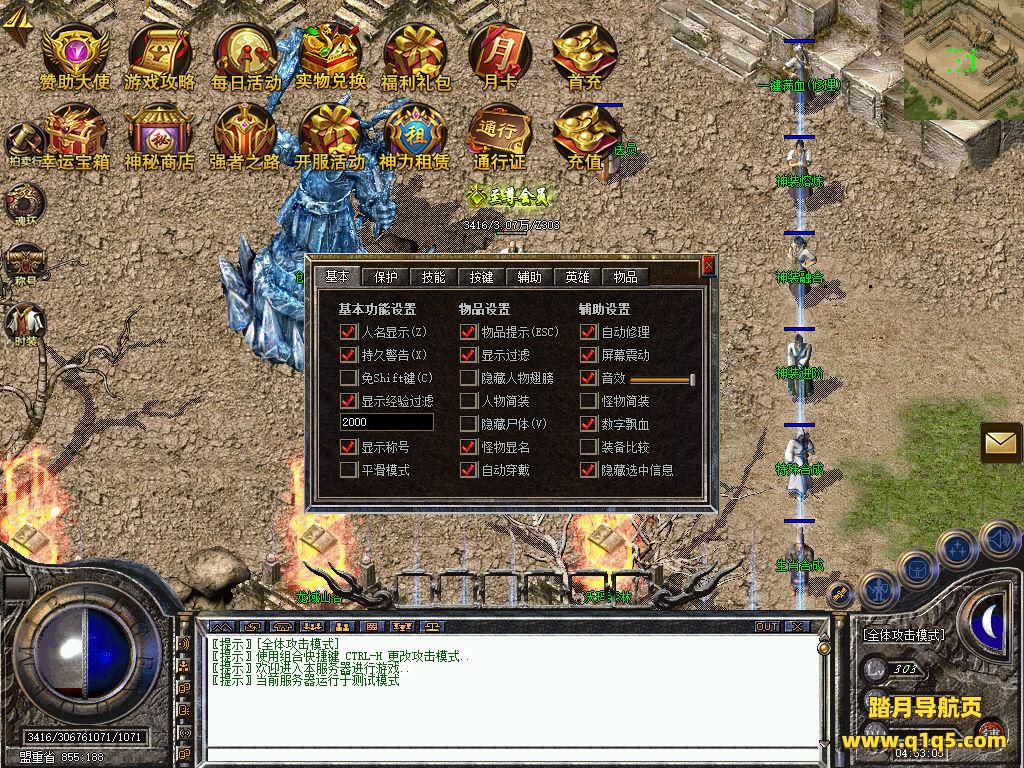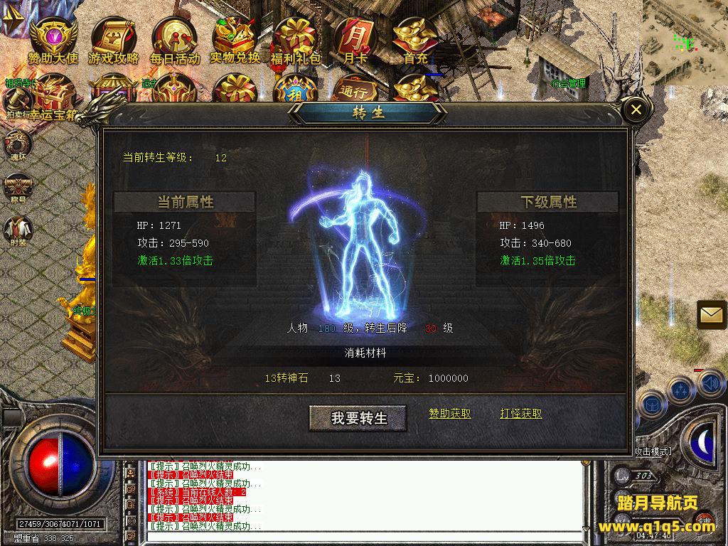 刚刚设置文本里的地方设置成你自己的角色名称,然后关闭引擎,引擎会自动启动好了。然后重新进入游戏。输入@make 物品名称 数量 来刷物品转生。行了。其他功能就自行测试吧。更多的游戏资源可以访问www.q1q5.com下载,我们每款游戏资源均单独制作了独立的视频架设教程,让小白也可以快速上手游戏架设,快来体验自己做GM的乐趣吧!