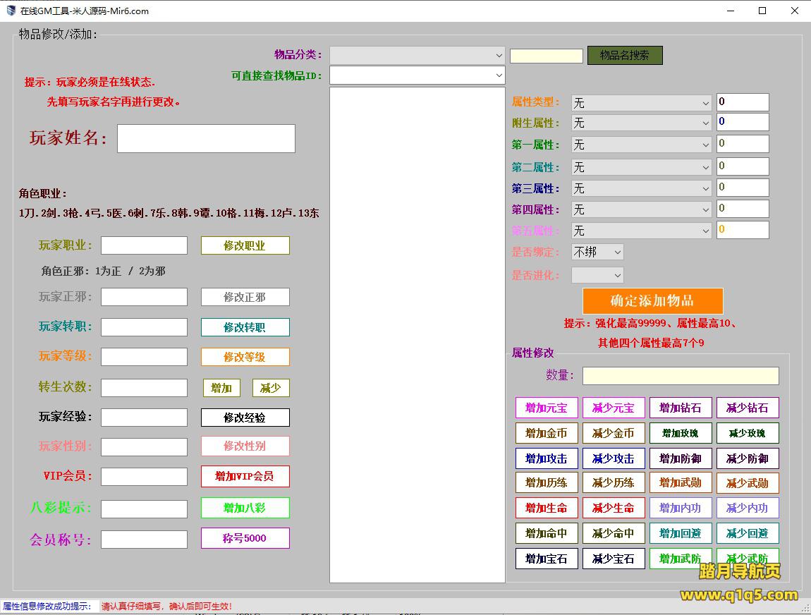 我们在测试下游戏里的功能看看。好了,其他功能就自行测试吧。更多的游戏资源可以访问www.q1q5.com下载,我们每款游戏资源均单独制作了独立的视频架设教程,让小白也可以快速上手游戏架设,快来体验自己做GM的乐趣吧!