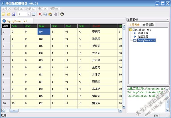 打开DataBaseEditor(动态数据编辑器),打开刚刚导出的文件EquipBase.txt.文件里的物品列表一目了然,第1个就是我们要修改的”青铜刀”,双击要修改的数据即可进入编辑模式,修改完毕保存.