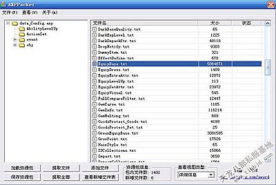 打开AXPPacker加载资源包,选择data目录下data_Config.axp资源文件,我们可以看见资源包里有很多动态数据文本,EquipBase.txt就是包含天龙八部所有物品属性数据的文件,和服务端PublicConfig目录下的EquipBase.txt文件内容相对应,选择导出文件.