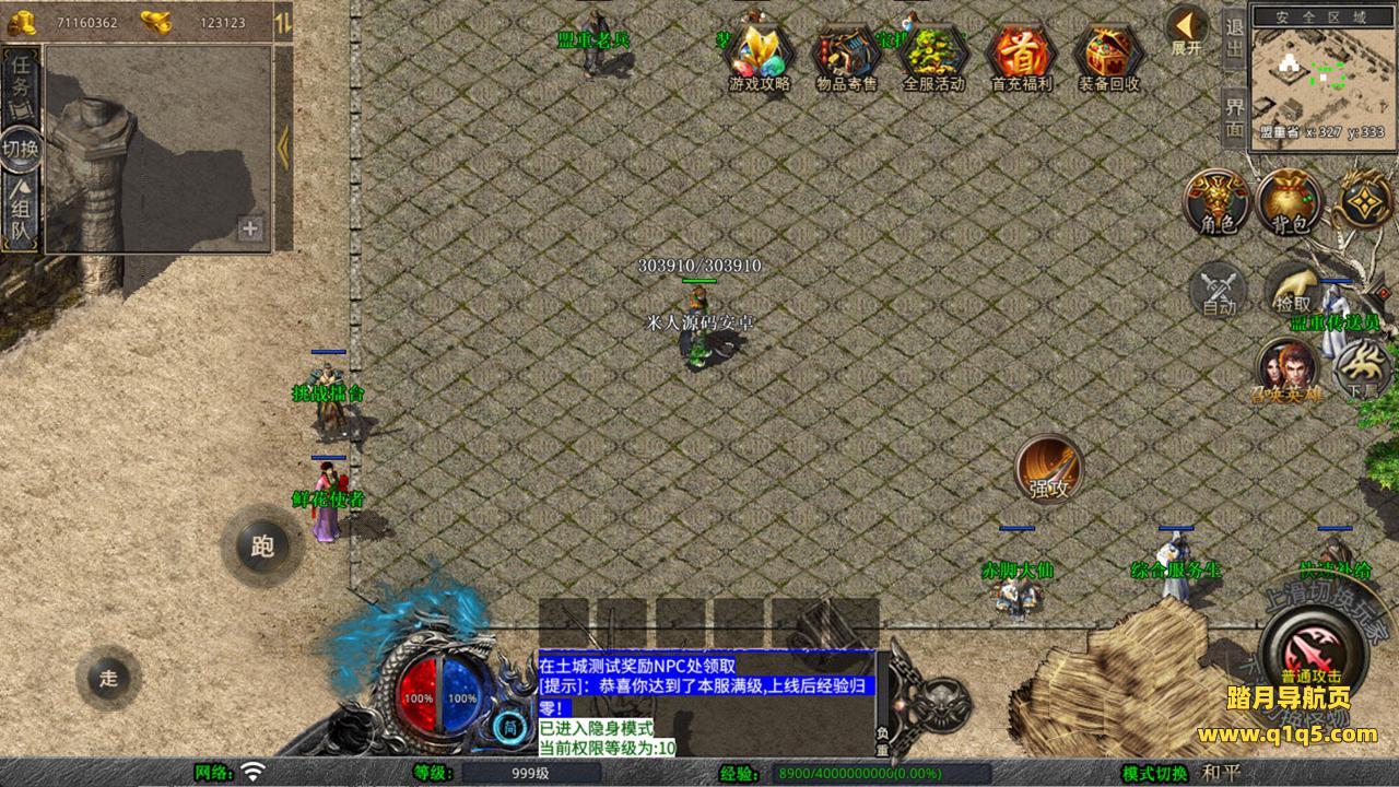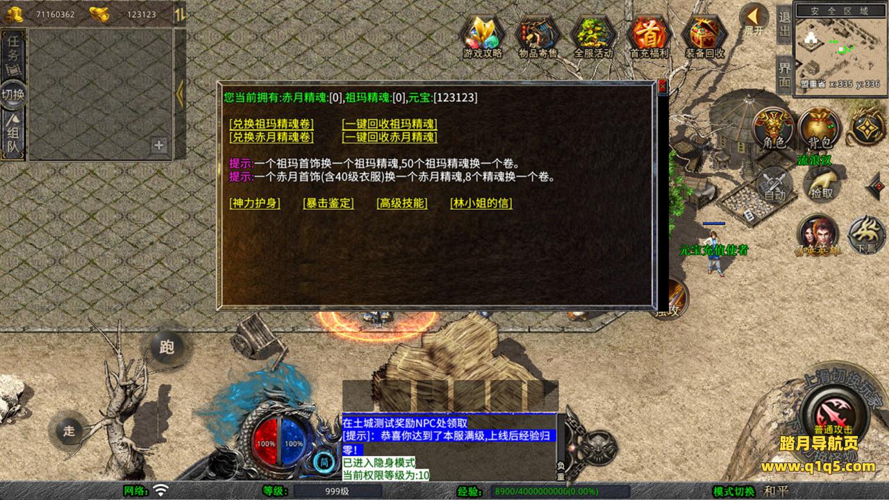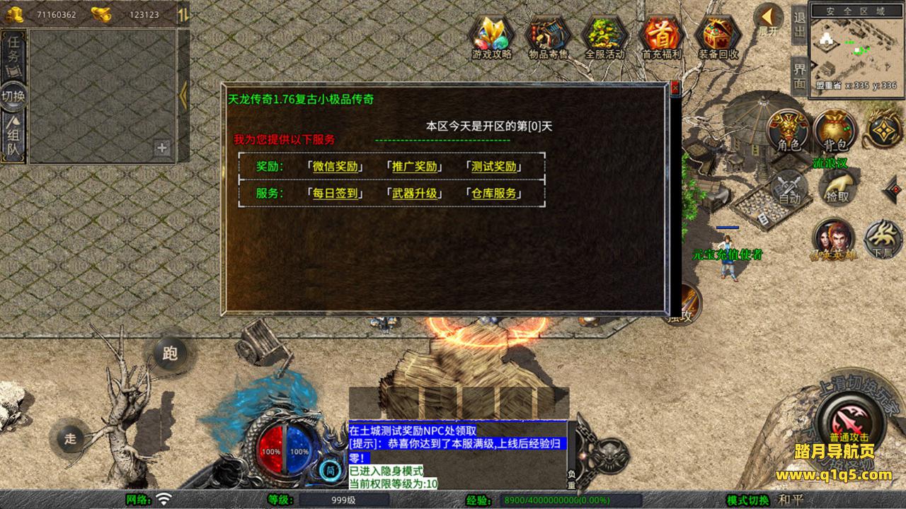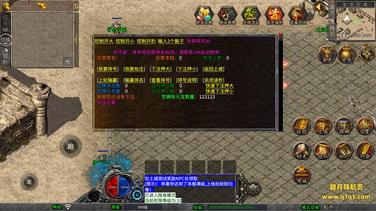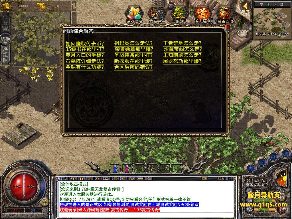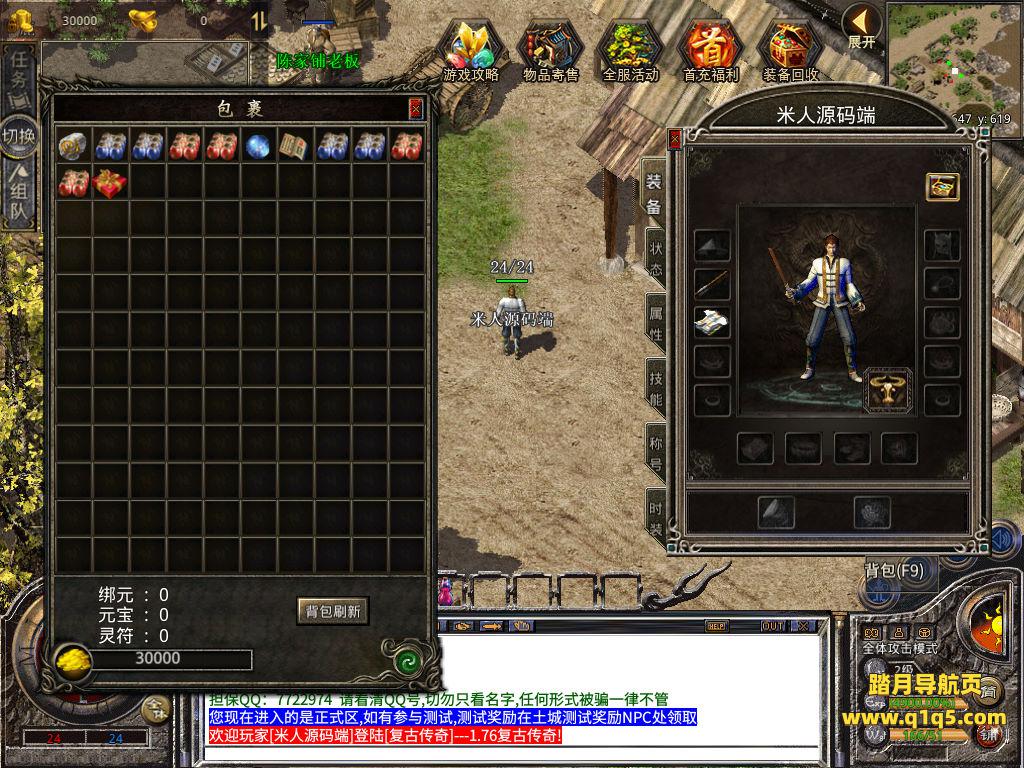 下面我们来测试下游戏里的功能看看。好了,其他功能就自行测试吧。更多的游戏资源可以访问www.q1q5.com下载,我们每款游戏资源均单独制作了独立的视频架设教程,让小白也可以快速上手游戏架设,快来体验自己做GM的乐趣吧!