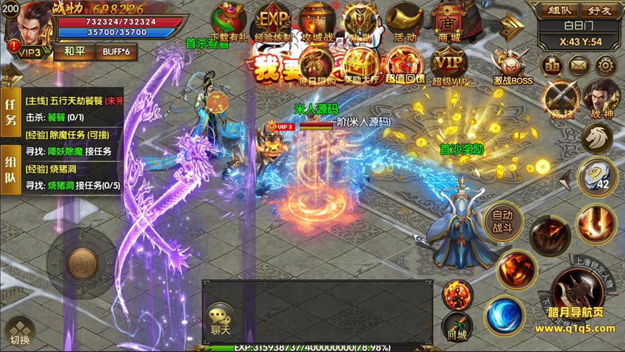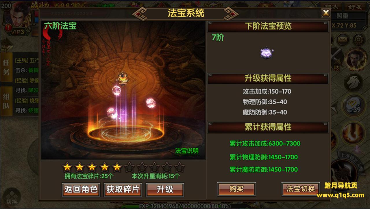 (法宝系统):升级法宝可获得属性加成及酷炫外观、对应法宝装备,法宝材料可充值VIP获取、法宝塔、各大BOSS身上有爆哦!