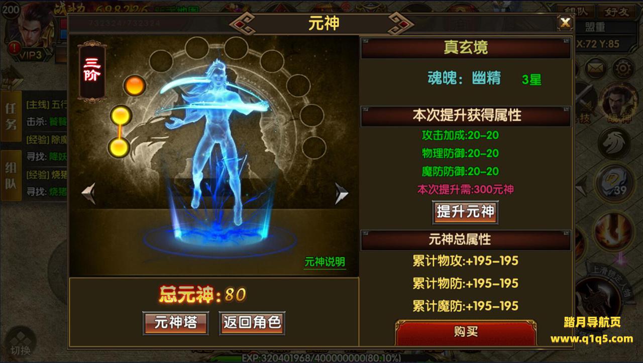 (元神系统):升级元神可获得属性加成,元神材料可充值VIP获取、元神塔、各大BOSS身上都有爆哦!