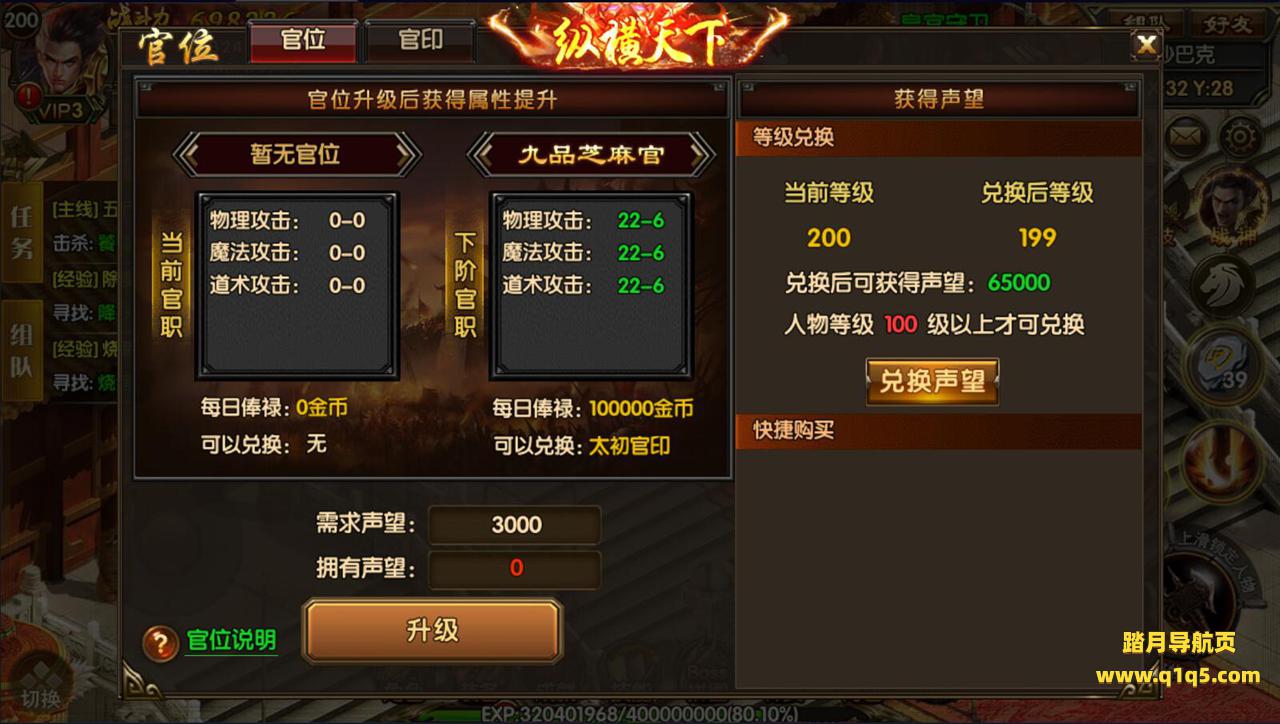 (佣兵战场):打怪获得声望值可升级官位、荣耀值兑换官印、刷满官位可去葬龙谷,爆1-9转装备哦!