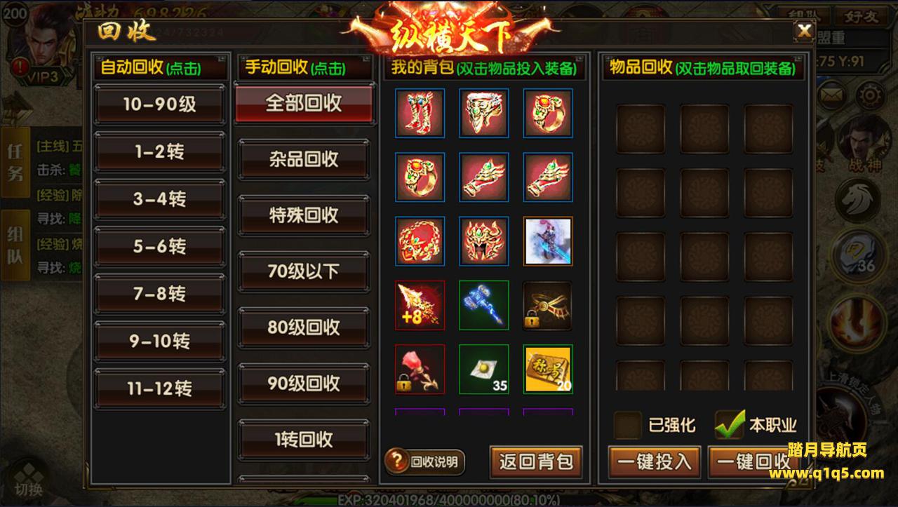 (自动回收):玩家挂机打怪可在回收界面或盟重【自动回收】NPC开启自动回收装备哦!让您自动挂机打宝无忧