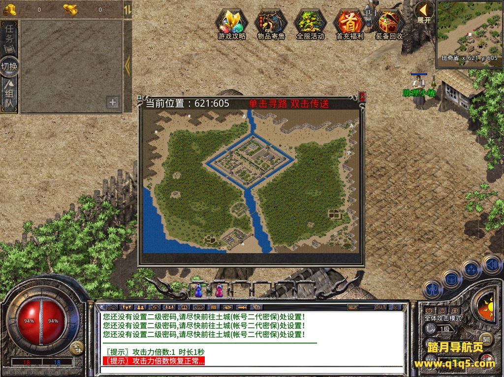 下面我们去测试下游戏里的功能看看。遇到刚刚我一样一直无法设置二级密码,是因为我们第一次搭建后,需要先用GM角色点击一次二级密码设置NPC,让它初始化即可。我们去设置角色为管理员权限。顺便试试在建立普通角色是否可以正常设置二级密码。可以没问题。